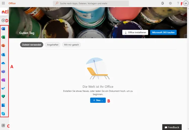Nach dem ersten Login mit Ihrem Benutzernamen gelangen Sie auf die Übersichtsseite. Auf der linken Seite sehen Sie die wichtigsten verfügbaren Programme, Bild 2 (A). Klicken Sie auf eines der Symbole, wird die App im Webbrowser gestartet. Alternativ klicken Sie auf die Schaltfläche Neu (B) und wählen dort das gewünschte Programm aus. Falls Sie eine App oder ein Programm nutzen möchten, das nicht aufgelistet ist, klicken Sie auf das Symbol unten links im Fenster (C), worauf alle verfügbaren Apps eingeblendet werden.