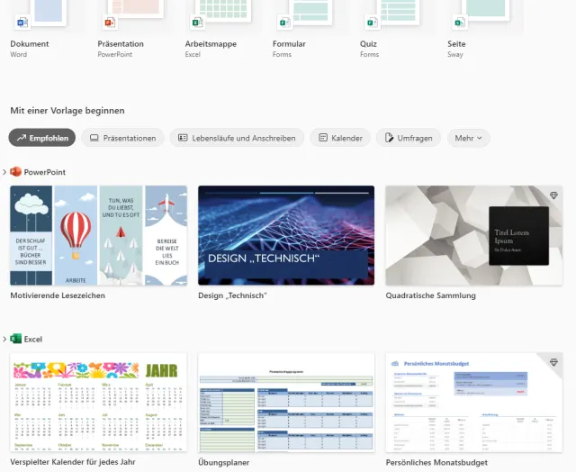 Wenn Sie eher nach Lösungen als nach einem bestimmten Programm suchen – etwa zum Erstellen eines Quiz, Kalenders, einer Umfrage etc. –, klicken Sie oben links aufs Plus-Symbol (D). Sie werden auf eine Seite weitergeleitet, auf der Sie eine grosse Bibliothek von Vorlagen finden, Bild 3. Klicken Sie auf eine der Vorlagen, wird diese im passenden Programm oder Onlinedienst geöffnet.