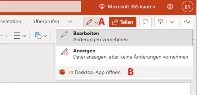 Wenn Sie beim Arbeiten mit Office Online eine Funktion vermissen, die Sie aus der Desktop-App kennen (und wenn diese auf dem Computer, an dem Sie arbeiten, installiert ist), klicken Sie auf das Bleistiftsymbol in der Menüleiste, Bild 5 (A), und auf In Desktop-App öffnen (B). Sie können nun in der Desktop-Version weiter­arbeiten. Wenn Sie das Programm schliessen, werden alle Änderungen automatisch übernommen.