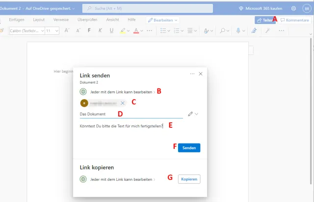 Weil Office Online die Dokumente grundsätzlich auf OneDrive ablegt, können sie besonders einfach für andere Nutzerinnen und Nutzer freigegeben werden. Dazu klicken Sie oben rechts im Menü auf Teilen, Bild 6 (A), um das Fenster Links senden zu öffnen.