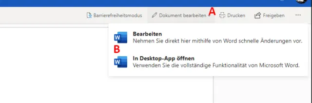 Klicken die Empfängerinnen und Empfänger auf den Link in der erhaltenen E-Mail, wird das Dokument in Office Online geöffnet – vorerst nur zum Ansehen. Zum Bearbeiten braucht es zunächst einen Klick auf Dokument bearbeiten, Bild 7 (A), gefolgt von der Auswahl einer der folgenden Optionen (B):