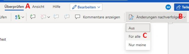Falls Sie die Kontrolle über die Änderungen behalten möchten, klicken Sie (bereits vor dem Teilen des Dokuments) auf den Reiter Überprüfen, Bild 9 (A), und auf die Schaltfläche Änderungen nachverfolgen (B). Wählen Sie die Option Für alle (C). Das bewirkt, dass die Anpassungen am Dokument farblich hervorgehoben werden und einzeln akzeptiert oder verworfen werden können.