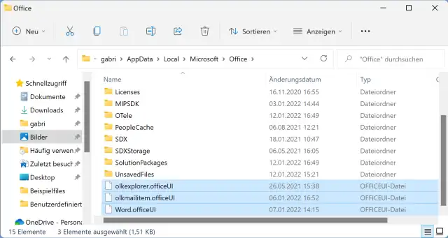 Diese drei Dateien mit Endung .officeUI enthalten die Menüband-Einstellungen, im vorliegenden Fall für Outlook und Word
