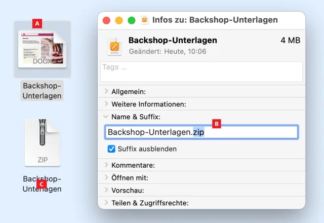 Sollte es bei der Konvertierung von sehr grossen oder komplexen Office-Dokumenten zu unerwarteten Problemen kommen, lassen sich immer noch Bilder und andere Informationen aus der Microsoft-Office-Datei extrahieren. Markieren Sie die Datei im Finder, Bild 2 A, und rufen Sie mit Command+I die Informationen auf. Ändern Sie unter Name & Suffix B die Dateierweiterung auf .zip, denn Office-Dateien sind nichts anderes als Zip-Archive. Danach lässt sich die ehemalige Office-Datei mit einem Doppelklick entpacken C und gibt ihren Inhalt preis.