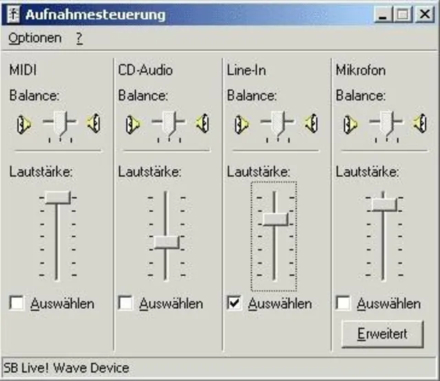 [1][2]Um das Signal nun auf dem PC aufnehmen zu können, brauchen Sie eine entsprechende Software. Vielfach ist eine Aufnahme-Option bereits in den CD-R-Brennprogrammen eingebaut, doch bessere Qualität und mehr Möglichkeiten in der Soundbearbeitung bieten Programme wie CoolEdit oder Goldwave . Bei der Aufnahme eines analogen Signals über den Line-Eingang der Soundkarte ist zu beachten, dass das Signal nicht zu laut ist, da sonst starke Verzerrungen in der Aufnahme auftreten können. Stellen Sie den Eingangspegel mit Hilfe des Windows-Mixers so ein, dass die Aussteuerung im Aufnahmeprogramm immer unterhalb des Maximalwertes bleibt. Öffnen Sie die Windows Lautstärkeregelung und wechseln Sie über Optionen/Eigenschaften zur Ansicht "Lautstärke regeln für Aufnahme". Wählen Sie nun als Aufnahmequelle den Line-In Regler und stellen die Aufnahmelautstärke ein. Die MiniDisc muss dafür abgespielt werden, damit ein Signal empfangen wird.