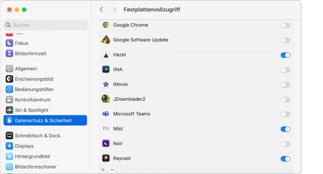 Quelle: PCtipp.chUm startfähige Installationsmedien anzulegen, benötigt Mist den Vollzugriff auf die Festplatte. Öffnen Sie die Einstellungen des Macs. Im Bereich Datenschutz & Sicherheit wählen Sie auf der rechten Seite den Bereich Festplattenvollzugriff. Klicken Sie anschliessend auf das Pluszeichen ganz unten, wählen Sie Mist im Programme-Ordner aus und erteilen Sie ihm den Zugriff auf die ganze Festplatte.