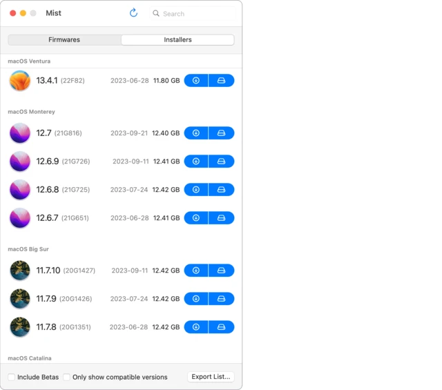 Hier kommt Mist ins Spiel. Das Akronym steht für «macOS Installer Super Tool». Eine simple Oberfläche ermöglicht den direkten Download aller macOS-Versionen der letzten Jahre. Dabei werden nicht nur die offiziellen Releases angeboten, sondern auch Entwickler-Betas, öffentliche Betas und sogar Firmware-Updates.