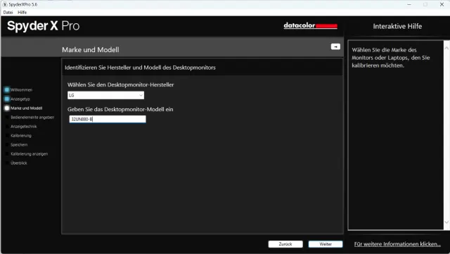 In der Folge erscheinen einige Fragen zu Ihrem Bildschirm. Zunächst, ob es sich um einen Desktop- oder Laptop-Monitor handelt. Beantworten Sie die Frage und gehen Sie einen Schritt weiter. Bei gewissen Bildschirmen erkennt die Spyder-Software automatisch den Hersteller und das Modell, Bild 6. Ist das nicht der Fall, können Sie den Hersteller aus der Liste auswählen und das Modell manuell eintragen.