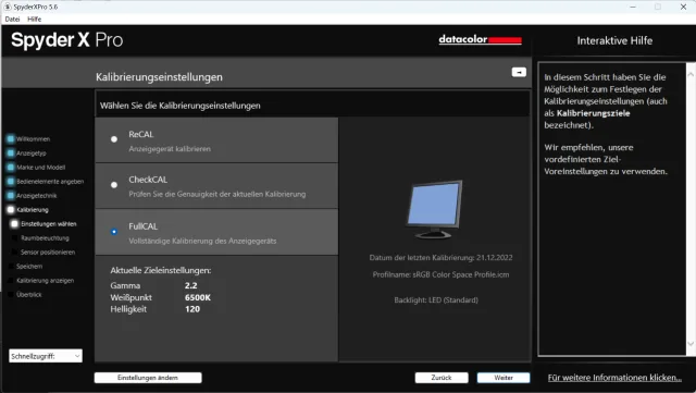 Quelle: PCtipp.chSpyderX schlägt Ihnen standardmässig die Einstellungen von Gamma 2.2, einem Weisspunkt von 6500 K und einer Helligkeit von 120 cd/Nits vor. Diese können Sie mit der Schaltfläche Einstellungen anpassen verändern. Gamma und Weisspunkt sollten Sie in den allermeisten Fällen so belassen. Die Helligkeit wird während FullCAL auf jeden Fall gemessen und angepasst. Zudem können Sie die Raumbeleuchtungsmessung aktivieren oder deaktivieren. Dabei misst SpyderX die Beleuchtung des Raumes und passt die Kalibrierung entsprechend an.