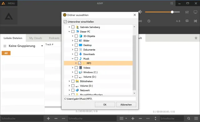 Übers Menü oben links gehts zu Ordner öffnen. Haken Sie den Ordner mit Ihren MP3-Dateien an. Darin ebenso die Option Unterordner einschliessen. Klicken Sie auf OK, tippen Sie einen Namen für die Wiedergabeliste ein (die Autorin nimmt «GabyTest»). Alle Songs werden nun in der rechten Spalte aufgelistet. Dazwischen sind auch Ordnertitel zu sehen, falls die Dateien in Ordner einsortiert sind.