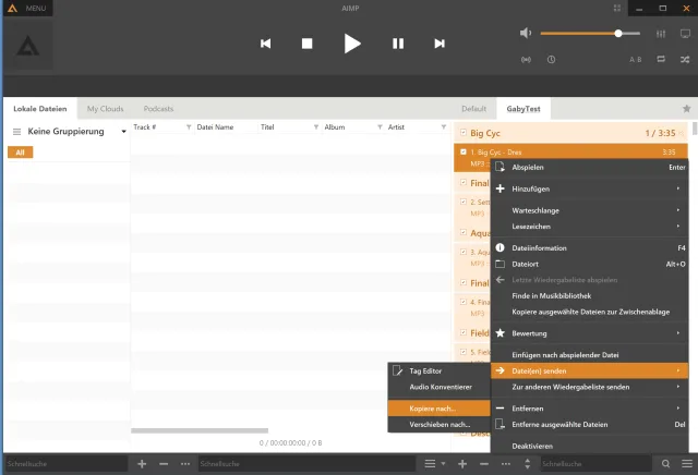 Nun werden die Dateien in zufälliger Reihenfolge angezeigt. Klicken Sie wieder einen Song an und drücken Sie Ctrl+A (Strg+A), um alle zu markieren. Klicken Sie mit rechts auf eine der Dateien und gehen Sie im Kontextmenü via Datei(en) senden zu Kopiere nach.