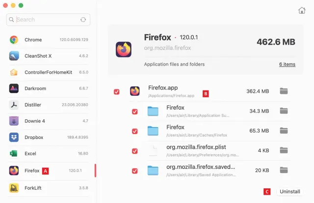 Dem tritt Pearcleaner entgegen: Die Software listet beim Start alle installierten Programme auf. Ein Klick in der Liste reicht A, dass die zugehörigen Ordner und Dateien angezeigt werden B. Danach passiert nichts – bis mit einem Klick auf die Schaltfläche Uninstall C, das Programm mitsamt Entourage gelöscht wird.