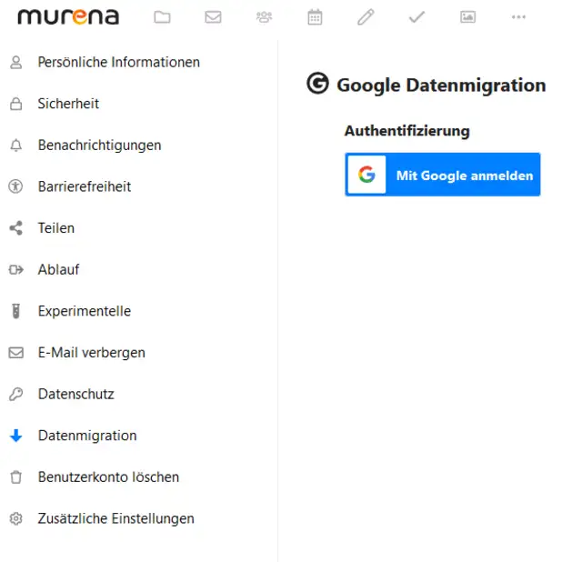 Menüpunkt Datenmigration mit Butten fürs Google-Konto-Login