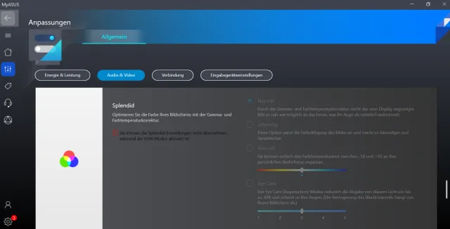 MyAsus Splendid soll sicherstellen, dass Asus-Bildschirme identische und getreue Bilder anzeigen. Es gibt den Normalen Modus, Lebendig (vivid), den manuellen Modus und Eye Care (Augenschonmodus).