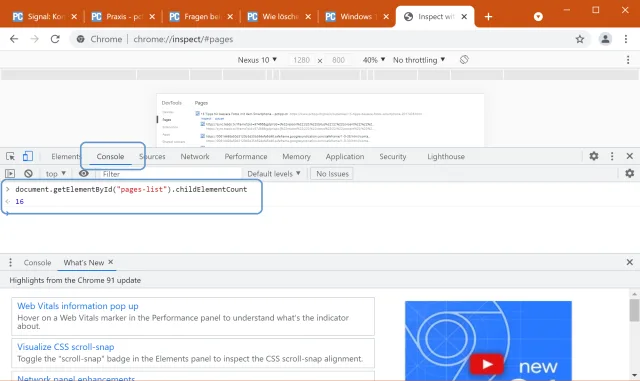 Und so gehts: Öffnen Sie ein neues Tab und gehen Sie darin zu chrome://inspect/#pages. Öffnen Sie übers Drei-Punkte-Menü oben rechts den Punkt Weitere Tools/Entwicklertools. Im unteren Teil des Chrome-Fensters erscheinen die Entwicklerwerkzeuge. Wechseln Sie darin zum Tab Console. Tippen oder kopieren Sie ins grosse Code-Eingabefeld den folgenden Befehl und drücken Sie Enter: