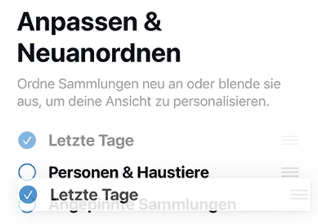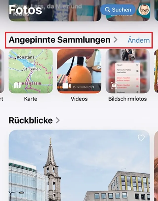 Tipp: Angepinnte Sammlungen befinden sich idealerweise weit oben. Die letzten Ferien, Lieblingspersonen oder besondere Ereignisse lassen sich so schnell finden – und natürlich herumzeigen.