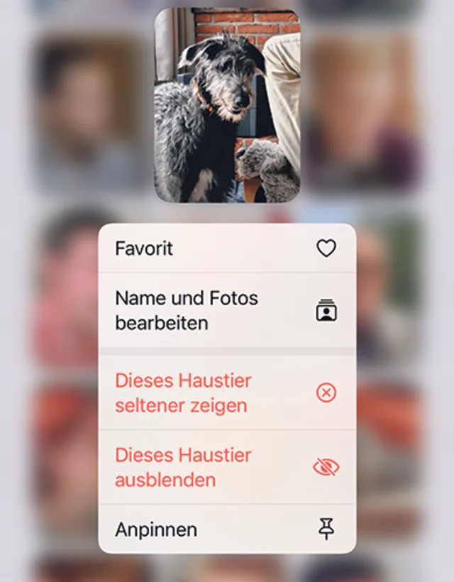 Quelle: PCtipp.chBei diesem «grössten Redesign aller Zeiten» (O-Ton Apple) gibt es unzählige Neuerungen zu entdecken. Deshalb ist es eine gute Idee, bei jeder Gelegenheit etwas länger auf ein Objekt zu drücken, um zu sehen, was passiert. Wenn etwa die Sammlung Personen & Haustiere geöffnet und etwas länger auf einen Eintrag gedrückt wird, erscheint ein Einblendmenü, Bild 3. Ausserdem lässt sich das Symbol sogar an eine andere Stelle bewegen. Das funktioniert auch bei anderer Gelegenheit, etwa bei den selbsterstellten Alben.
