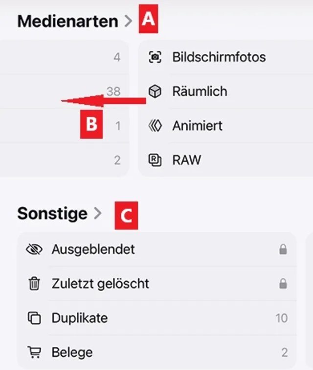 Die Medienarten sind zwar nicht neu; aber sie bilden nun ebenfalls eine eigene Sammlung mit Unterkategorien, Bild 5 A. So wird auf einen Blick ersichtlich, wo die Panoramen, RAW-Aufnahmen oder die «räumlichen» Fotos und Videos stecken – falls es die Apple Vision Pro jemals in die Schweiz schafft und uns das 3D-Sehen neu vermittelt.