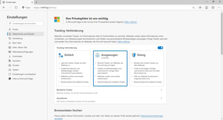 Bild 7: Die Anti-Tracking-Einstellungen von Edge sind leicht verständlich und übersichtlich