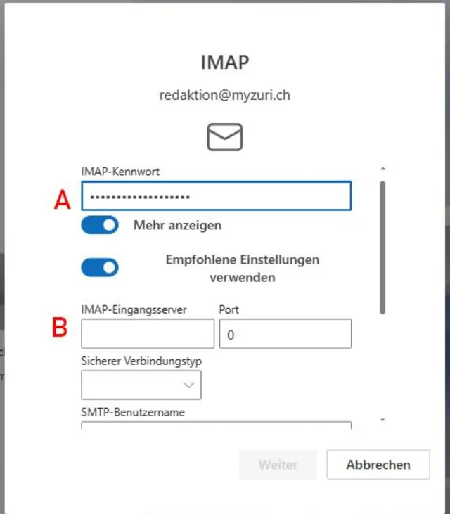Geben Sie Nutzername, Passwort und die IMAP-Einstellungen Ihres Anbieters ein B. Schliessen Sie die Eingabe mit einem Klick auf die Schaltfläche Weiter ab.