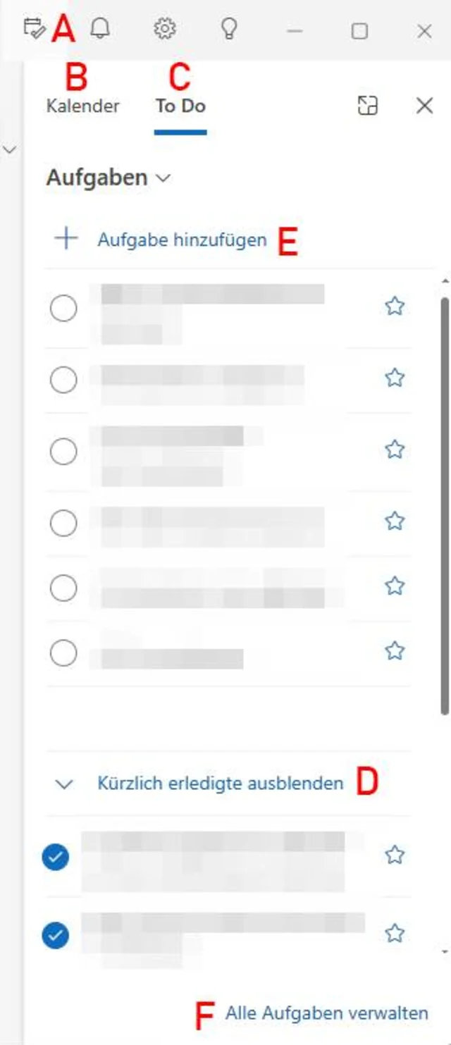 Im Reiter To Do C werden oben anstehende Aufgaben und unten kürzlich erledige Aufgaben aufgelistet D. Mit einem Klick auf das Kreis-Symbol wird die Aufgabe als erledigt gekennzeichnet. Markieren Sie das Stern-Symbol erhält die Aufgabe den Status wichtig. Mit einem Klick auf Aufgabe hinzufügen E wird eine neue Aufgabe in die Liste aufgenommen.
