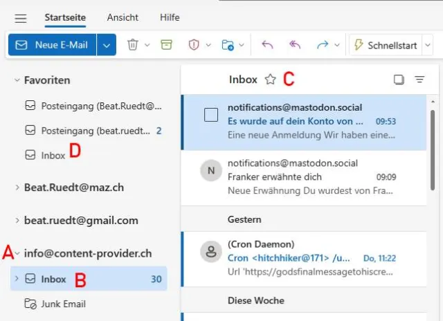 Wenn Sie mehrere Konten in Outlook integrieren, ist es praktisch, einzelne Ordner wie den jeweiligen Posteingang, ganz oben in der Kontenübersicht anzuzeigen. Klicken Sie als Erstes auf das kleine Winkel-Symbol beim Kontonamen, um alle Ordner anzuzeigen, Bild 6 A. Wählen Sie jetzt den Ordner, der zu den Favoriten hinzugefügt werden soll B und aktivieren Sie auf der rechten Seite mit einem Klick den Stern neben dem Ordnernamen C. Anschliessend wird der Ordner unter den Favoriten angezeigt D.