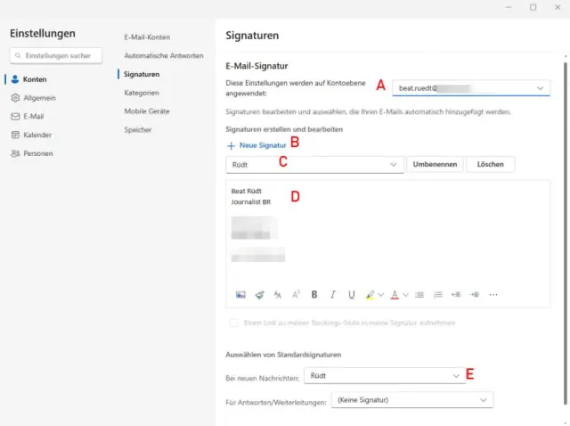 Quelle: PCtipp.chKlicken Sie auf den Punkt + Neue Signatur B. Geben Sie einen Namen für die Signatur ein C. Tippen Sie danach Text und Bilder für die Signatur ein D. Klicken Sie unten im Fenster auf Speichern. Legen Sie fest, in welchem Fall die Signatur verwendet werden soll E. Klicken Sie erneut auf Speichern.