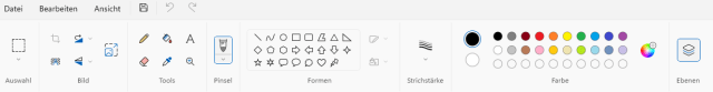 Ausser der leicht veränderten Vertriebsmethode via Microsoft Store gibt es drei weitere wichtige Neuerungen in Paint. Die Erste ist eher geringfügig: Die Menüleiste wurde leicht überarbeitet, Bild 4. Es handelt sich vor allem um eine Modernisierung. Die meisten Bedienelemente bleiben mehr oder weniger gleich, sehen einfach ein wenig schicker aus. Die zwei anderen Neuerungen haben es allerdings in sich.