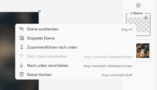 Das Augen-Symbol auf jeder Ebene dient dazu, Ebenen ein- oder auszublenden. Mit einem Rechtsklick auf eine Ebene erhalten Sie weitere Optionen, Bild 6: Sie können die Ebenen in der Hierarchie verschieben, duplizieren oder ganz löschen. Wählen Sie eine Ebene, die nicht der Hintergrund ist, erhalten Sie zudem die Option, die Ebene nach unten zusammenzuführen: Die Ebene wird mit der darunterliegenden verschmolzen.