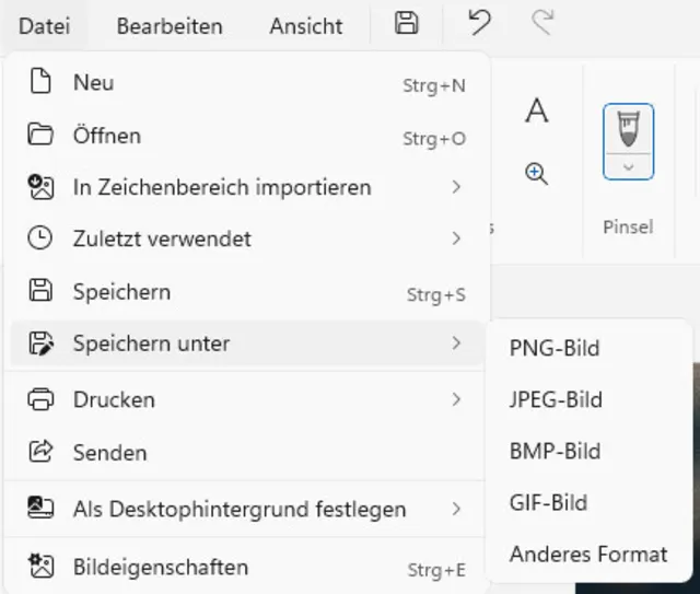 Quelle: PCtipp.chÜbliche Bildformate wie JPG, PNG oder GIF unterstützen keine Ebenen. Um ein Bild zu speichern, müssen Sie die Ebenen beim Export verschmelzen. Leider bietet Paint derzeit kein spezialisiertes Dateiformat an, mit dem Ebenen gespeichert werden können, wie das beispielsweise im PSD-Format von Photoshop möglich ist. Sobald Sie also Paint schliessen, gehen Ihre Ebenen verloren. Da Paint ohnehin eher für kleine Projekte gedacht ist, sollte das kein grösseres Problem darstellen. Will Microsoft aus Paint aber eine ernsthafte Bildbearbeitungs-App machen, wird das ein Pflichtfeature werden, Bild 7.