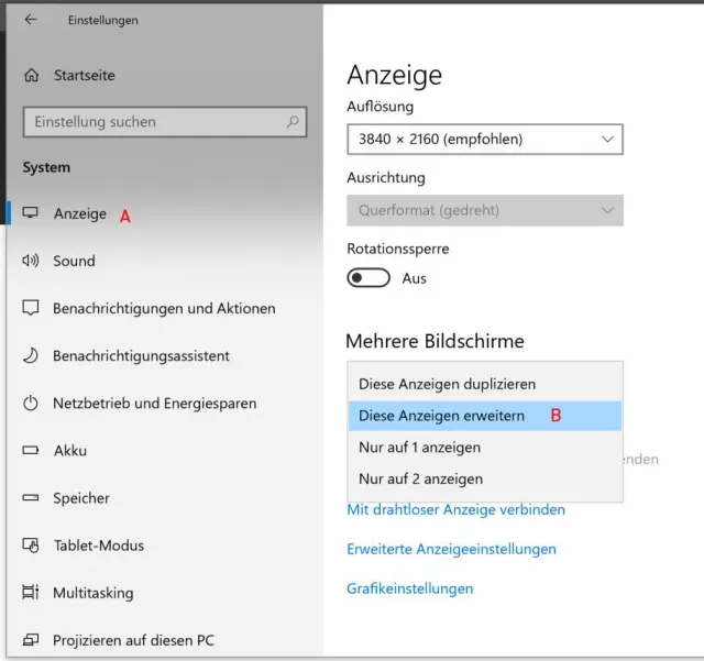 Quelle: PCtipp.chWenn Sie einen externen Bildschirm anschliessen, können Sie das Display des Notebooks auch noch als Zweitbildschirm nutzen. Besonders praktisch ist das, falls es sich beim Laptop um ein Convertible handelt, das Sie umgeklappt auf den Schreibtisch stellen. Wenn Sie einen externen Monitor anschliessen, sehen Sie auf beiden Bildschirmen dieselbe Anzeige. Um das zu ändern, klicken Sie in der Taskleiste auf das Windows-Symbol und danach auf das Zahnrad-Symbol, um zu den Windows-Einstellungen zu gelangen. Dort gehen Sie zu System und stellen sicher, dass Sie im Menü Anzeige sind, Bild 9 A. Scrollen Sie auf der rechten Seite nach unten und gehen Sie unter Mehrere Bildschirme zur Auswahl Diese Anzeige erweitern B. Nun können Sie für jedes geöffnete Programm entscheiden, auf welchem Bildschirm es angezeigt wird, indem Sie das Programmfenster auf den entsprechenden Schirm ziehen. Das ermöglicht Ihnen, zum Beispiel auf einem Monitor das E-Mail-Programm permanent im Blick zu haben, während Sie auf dem anderen Schirm Ihrer Arbeit nachgehen. Wenn Sie die Einstellungen rückgängig machen, indem Sie bei Mehrere Bildschirme wieder Diese Anzeige duplizieren einstellen, werden alle geöffneten Programme sofort wieder auf einem Bildschirm dargestellt.