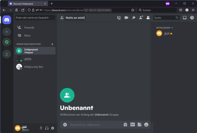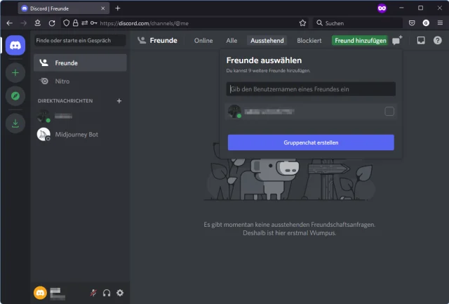 Wichtig! Auch wenn Sie in dieser Gruppe ausschliesslich sich selbst haben, muss sich in Ihrer Discord-Freundesliste mindestens ein weiterer Account befinden (auch wenn Sie diesen dann nicht zur Gruppe hinzufügen), sonst erscheint die Schaltfläche Gruppenchat erstellen nicht.