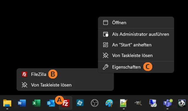 Haben Sie die Anwendung bereits in der Taskleiste verknüpft? Klicken Sie mit rechts auf das dortige Symbol der Anwendung (A). Im kleinen Pop-up mit (mindestens) dem Programmnamen und dem Befehl Von Taskleiste lösen klicken Sie erneut mit rechts auf den Programmnamen (B). Hier gehts zu den Eigenschaften (C).
