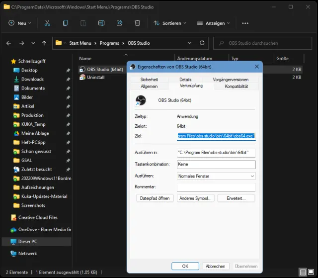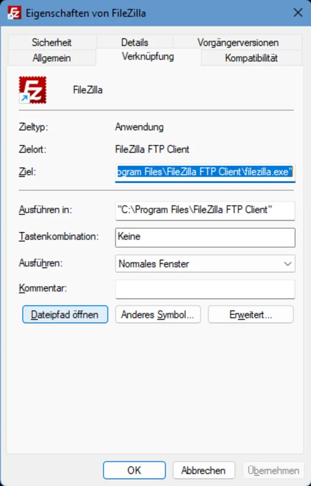 Die Verknüpfungseigenschaften führen auch hier zu «Dateipfad öffnen»