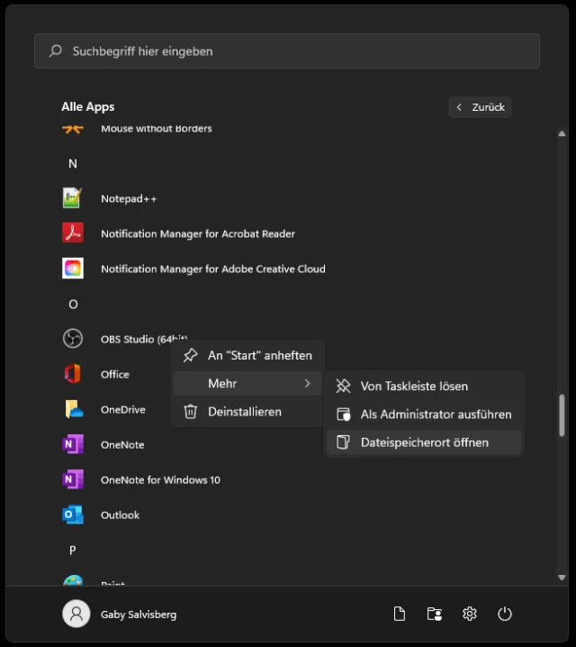 Haben Sie zur Anwendung keine Taskleisten-Verknüpfung erstellt, kommen Sie auch via Startmenü ans Ziel. Hier sind aber etwas mehr Schritte nötig. Klicken Sie auf Start und auf Alle Apps. Machen Sie in der Liste die Startmenü-Verknüpfung der betroffenen App ausfindig. Nach einem Rechtsklick darauf gehts zu Mehr, gefolgt von Dateispeicherort öffnen.