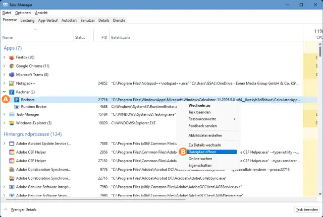 Im Reiter Prozesse entdecken Sie die App in der Liste der laufenden Apps. Meistens gehören mehrere Prozesse zu einer App. Klappen Sie darum den Eintrag übers Winkel-Symbol auf (A). Wenn Sie wollen, blenden Sie via Rechtsklick auf einen der Spaltentitel auch die Spalte namens Befehlszeile ein. Darin wäre der Pfad bereits zu sehen. Aber wenn Sie ohnehin den Pfad im Explorer haben wollen, klicken Sie mit rechter Maustaste auf den Eintrag und greifen Sie dort zu Dateipfad öffnen (B). Auch jetzt erscheint ein Explorer-Fenster, das die App-Dateien zeigt.