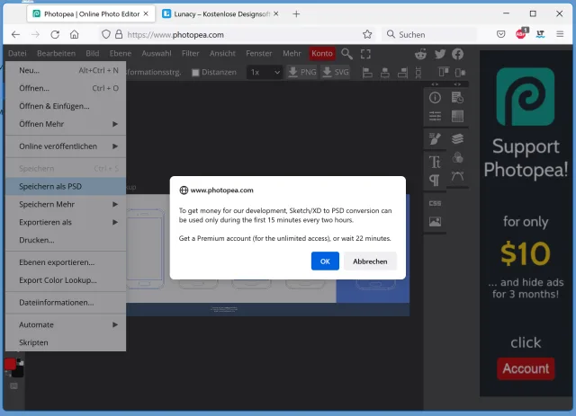 In Photopea lässt sich eine .sketch-Datei sogar ins PSD-Format exportieren, sofern man einen kostenpflichtigen Account hat oder es nicht eilig hat
