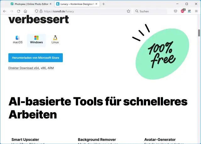 Lösung: Entweder verwenden Sie den Onlinedienst photopea.com oder Sie greifen zur kostenlosen Version von Icon8 Lunacy für Windows.