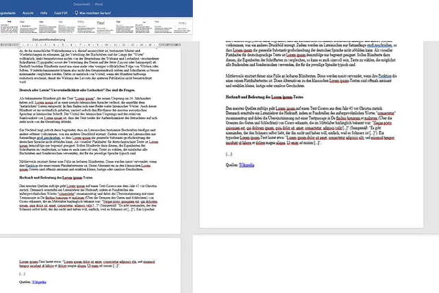 Andererseits: Es gibt noch einen anderen Weg. In unserem Text-Beispiel handelt es sich um eine (Wikipedia-)Blindtext-Definition, die wir statt auf zwei Seiten auf eine bringen möchten. Um die Schriftgrösse zu verkleinern, fügen wir den Befehl «Um eine Seite verkleinern» dem Schnellzugriff hinzu.