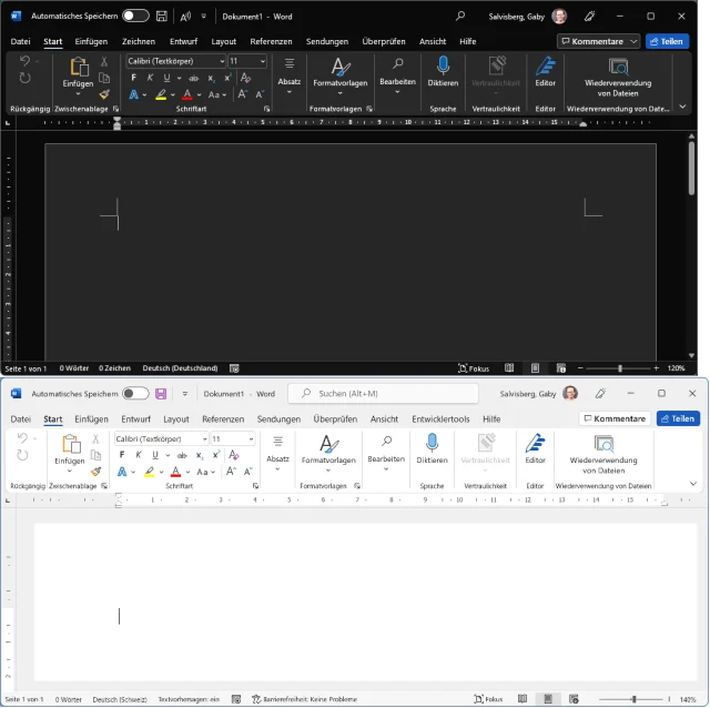 Wie gesagt, ist es eigentlich nur ein Workaround, denn man könnte durchaus gerne helle, freundliche Windows-Elemente wollen, während man die grossen Office-Anwendungsfenster im Dunkelmodus betreiben möchte. Aber man kann derzeit nur alles oder nichts pro Gerät haben.