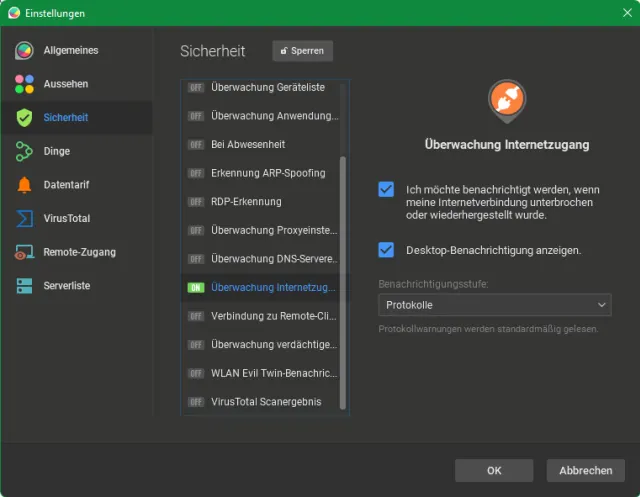 Quelle: PCtipp.chKlicken Sie auf Entsperren. Geht es Ihnen ausschliesslich ums Verfolgen von Verbindungsabbrüchen? Deaktivieren Sie sämtliche Überwachungsfunktionen, mit Ausnahme von Überwachung Internetzugang. Dort aktivieren Sie diese beiden Kästchen: Ich möchte benachrichtigt werden, wenn meine Internetverbindung unterbrochen oder wiederhergestellt wurde sowie Desktop-Benachrichtigung anzeigen. Lassen Sie es nun nebenher laufen. Wenn die Internetverbindung abbricht oder sich wieder aufrappelt, finden Sie diese Informationen im Reiter Alarme. Davon könnten Sie z.B. Ihrem Internetprovider einen Screenshot schicken.