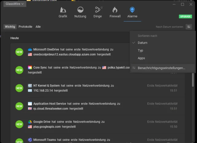 Wichtiger Hinweis, 1.6.2023: Der Hersteller von GlassWire erlaubt die hier beschriebene Funktion nur noch in der kostenpflichtigen Version des Programms, die auf ein Abo von 2 bis 3 US-Dollar pro Monat hinausläuft. Daher ist die Anwendung für Privatanwender, die bloss eine Weile die Downtimes ihres Internetzugangs messen wollen, inzwischen eher nutzlos.Ein anderes Tool, das ebenfalls ein Abbrechen der Internetverbindung protokollieren kann, aber etwas umständlich zu konfigurieren ist, heisst GlassWire. Nach der Installation des Tools stellen Sie das Tool auf Wunsch via GlassWire-Menü oben links auf Deutsch um. Wechseln Sie nun zu Alarme. Rechts finden Sie im oberen Bereich ein Symbol mit Schalthebeln. Klicken Sie drauf und öffnen Sie die Benachrichtigungseinstellungen.