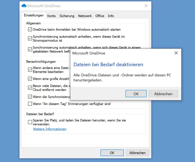 Quelle: PCtipp.chSie landen standardmässig im Reiter Konto. Wechseln Sie zum Reiter Einstellungen, der sich links davon befindet. Deaktivieren Sie unten bei «Dateien bei Bedarf» die Option «Sparen Sie Platz, und laden Sie Dateien herunter, wenn Sie sie verwenden». Bestätigen Sie die Rückfrage mit einem Klick auf OK und bestätigen das Einstellungsfenster ebenfalls mit OK.