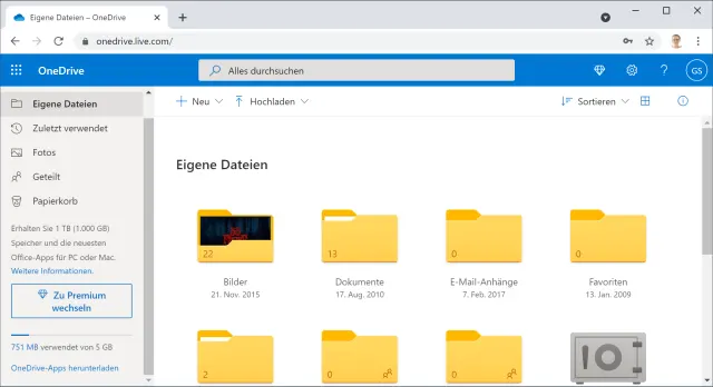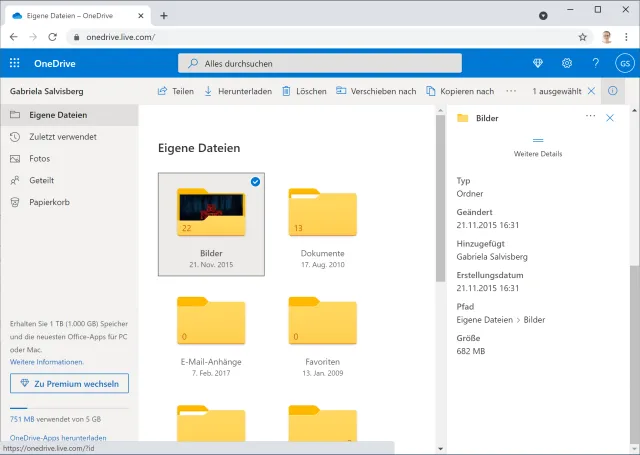 Ganz unten links erfahren wir: Es liegen nur 751 MB in diesem OneDrive-Konto