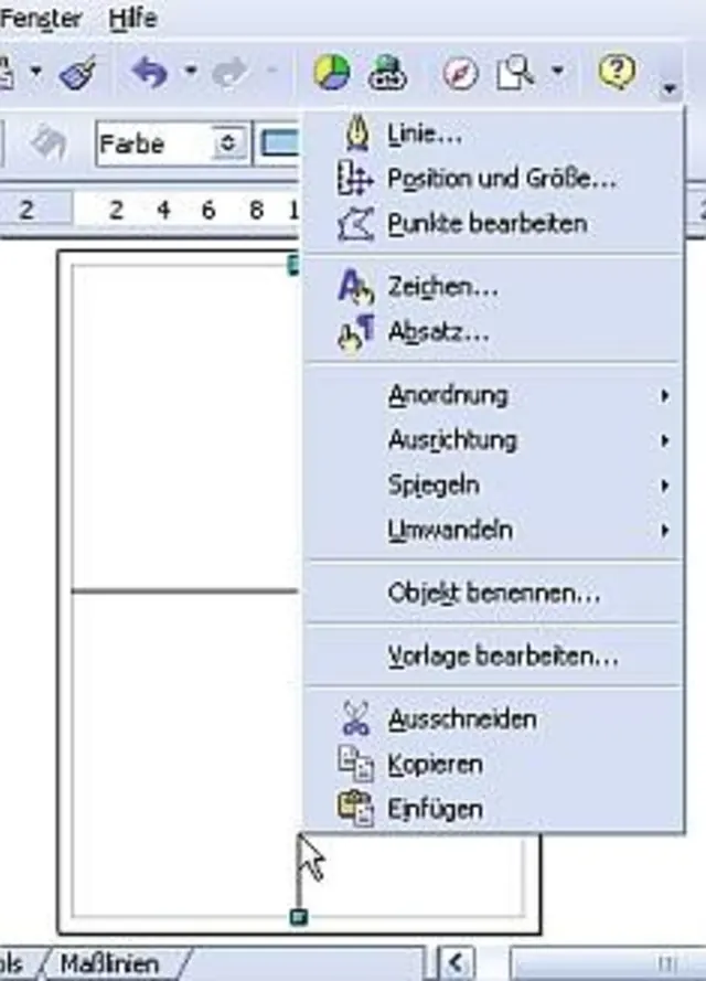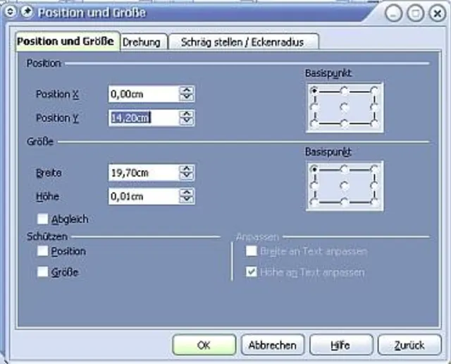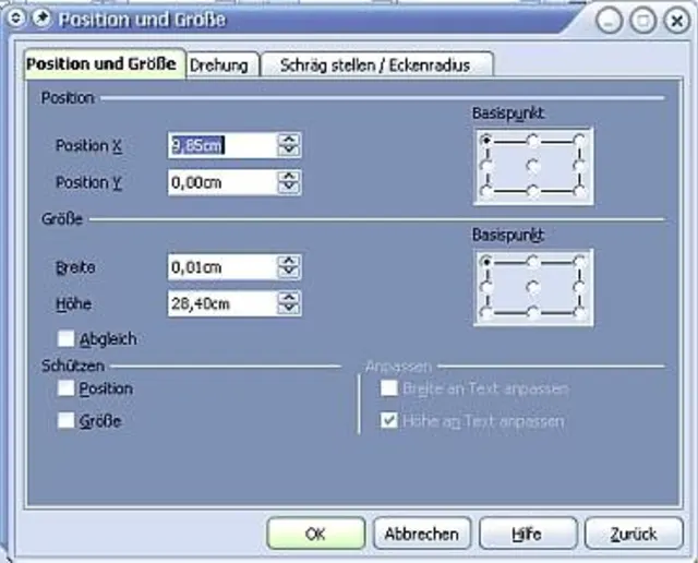 Der zweite Menüpunkt von oben heisst "Position und Größe...". Diesen wählen Sie an. Daraufhin öffnet sich ein Fenster, in dem Sie ganz exakt die Mitte des Blattes für die Position der Linie angeben können. Einmal für die X-Position (das heisst, für die vertikale Linie):