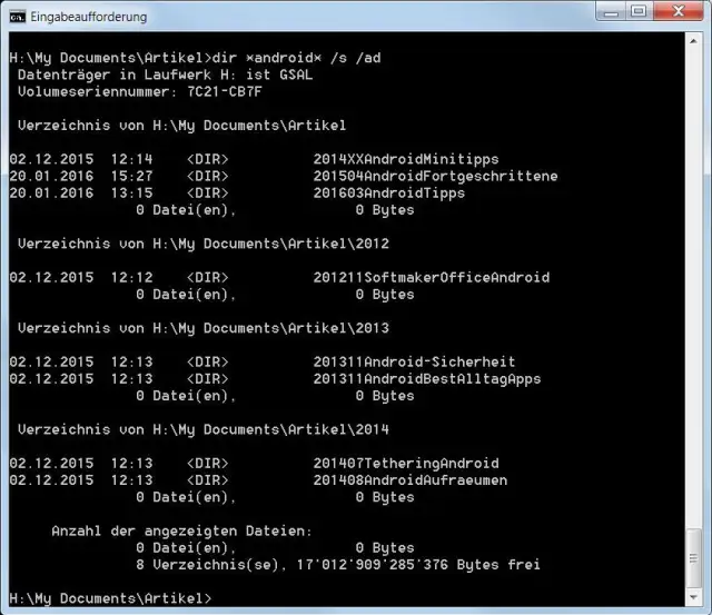 Lösung: Angenommen, Sie suchen gezielt nach einem Ordner, welcher die Zeichenfolge «android» enthält. Öffnen Sie über Windowstaste+R und Eingabe von cmd ein Konsolenfenster. Wechseln Sie aufs Laufwerk, das durchsucht werden soll, zum Beispiel mit H: und Enter zum Laufwerk H:. Tippen Sie dir ein und drücken Sie Enter, um die Ordner aufzulisten. Falls Sie sicher sind, dass der gesuchte Ordner in einem dieser Unterordner liegt, können Sie noch mit cd ordnername (z.B. cd daten) in den Ordner wechseln.