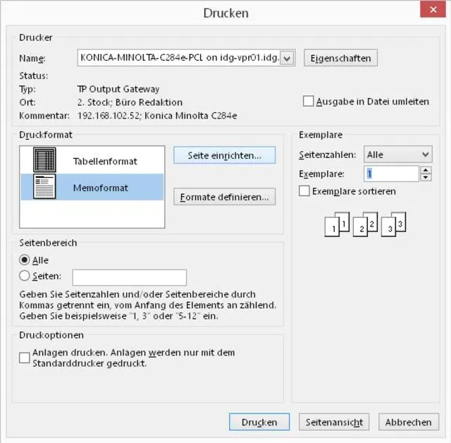Das fürs Drucken einzelner Mails verwendete «Memoformat» ist nun meistens schon markiert. Falls nicht, klicken Sie drauf. Jetzt gehts weiter zu Seite einrichten.