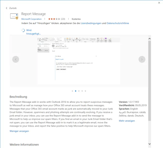 Installation: In Outlook klicken Sie im Reiter Start im rechten Bereich des Menübandes auf Add-Ins abrufen. Im Add-Ins-Bereich angekommen, suchen Sie übers Suchfeld oben rechts nach Report Message. Die gefundene Erweiterung heisst Report Message und stammt von «Microsoft Corporation».