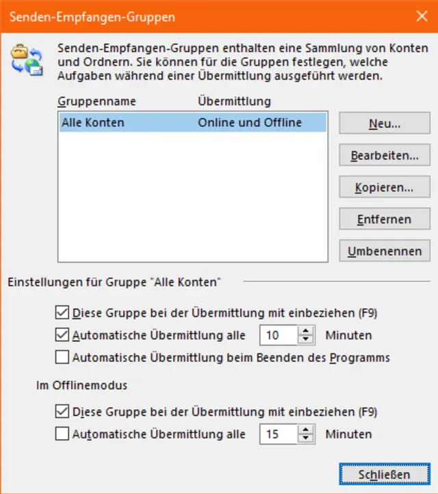 Die Ursache liegt gelegentlich in einer defekten Senden-Empfangen-Gruppe. Das lässt sich aber mit den folgenden Schritten beheben. Öffnen Sie Datei/Optionen/Erweitert. Klicken Sie im Bereich «Senden und empfangen» auf die Schaltfläche Senden/Empfangen. Im Feld unter «Gruppenname» klicken Sie die betroffene Gruppe an (z.B. Alle Konten) und klicken auf Kopieren. Für den Namen tippen Sie einen neuen Gruppennamen ein, z.B. «Alle Konten 2».