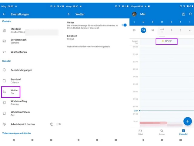 Seit vergangenem Jahr kann man sich in der Outlook-App das Wetter anzeigen lassen. Vielleicht werden Sie nach einem Update direkt nach dem Öffnen danach gefragt. Falls nicht, können Sie diese Funktion folgendermassen aktivieren: